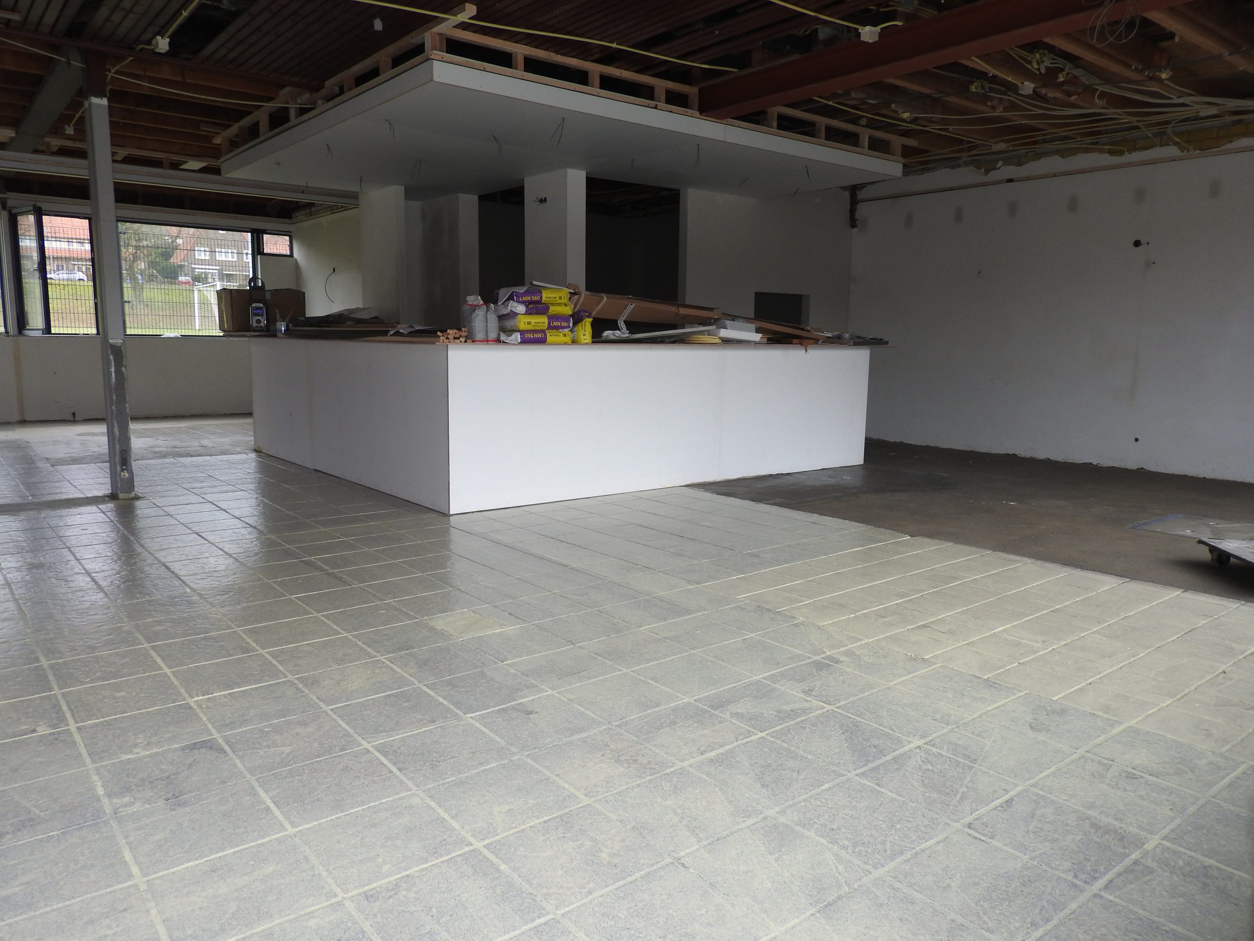 Er is een begin gemaakt met het leggen van projectvinyl in de keuken en rondom de bar. Grondig is de vloer voorafgaand geschuurd en alle stof verwijderd. Daarna is de lijm opgebracht en stukje voor