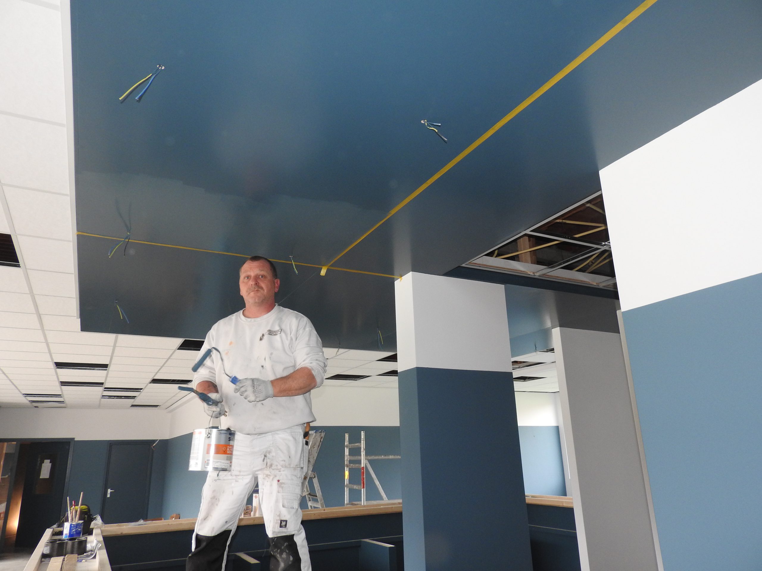 ”Om aanzetten te voorkomen worden de randen van het plafond boven de bar afgeplakt en worden de platen voor de zoveelste keer geverfd”. Toch een precisiewerkje. De schilders zijn de hele week actief, deurtje hier